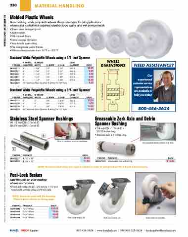 Non-marking, white polyolefin wheels. Recommended for all applications where strict sanitation is required. Ideal for food plants and wet environments. • Steam clean, detergent proof.