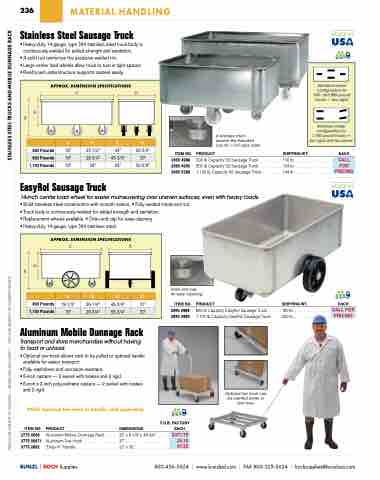 500 lb Capacity SS Sausage Truck . . . . . . . . . . . 110 lb . . . . . . . . . . . . . . . . . . 800 lb Capacity SS Sausage Truck . . . . . . . . . . . 104 lb . . . . . . . . . . . . . . . . . . 1,100 lb Capacity SS Sausage Truck . . . . . . . . . 144 lb . . . . . . . . . . . . . . . . . .