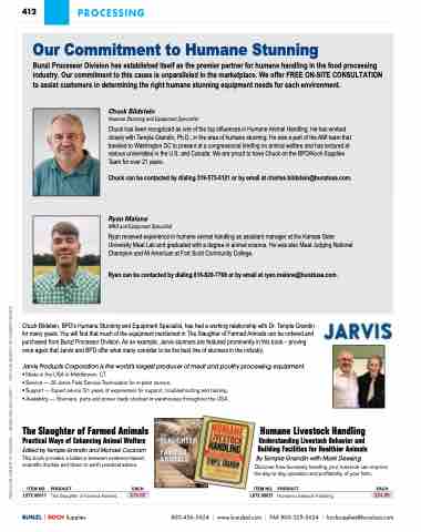 Chuck Bildstein, BPD’s Humane Stunning and Equipment Specialist, has had a working relationship with Dr. Temple Grandin for many years. You will find that much of the equipment mentioned in The Slaughter of Farmed Animals can be ordered and purchased from Bunzl Processor Division. As an example, Jarvis stunners are featured prominently in this book – proving once again that Jarvis and BPD offer what many consider to be the best line of stunners in the industry.